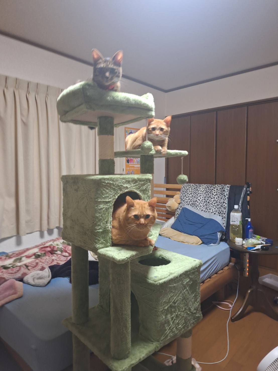 今回は緑色の可愛いタワーで猫ちゃん達も喜んでます。